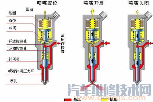 噴油器(維修中通常稱噴油嘴)的噴油由電磁閥控制,在精密計算噴油量及噴油時間長短后將燃油送入氣缸內,能使燃油在各種負載及轉速下產生最佳的燃燒。空氣溫度、壓力信號、氧傳感器信號輸入至PCM后,PCM經過內部運算后輸出驅動信號至噴油嘴,使空燃比維持在理想值。