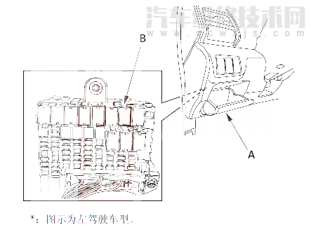 19 拆下駕駛員側儲物箱(A),然后將ETCS控制繼電器(B)從儀表板下保險絲/繼電器盒上拆下