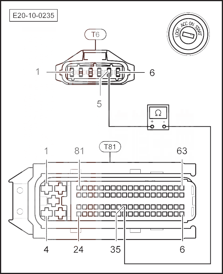 02-07 點火開關至LOCK狀態時,測量電子油門踏板位置傳感器插頭T6的5針腳至發動機控制單元插頭T81的35針腳之間導線是否導通。