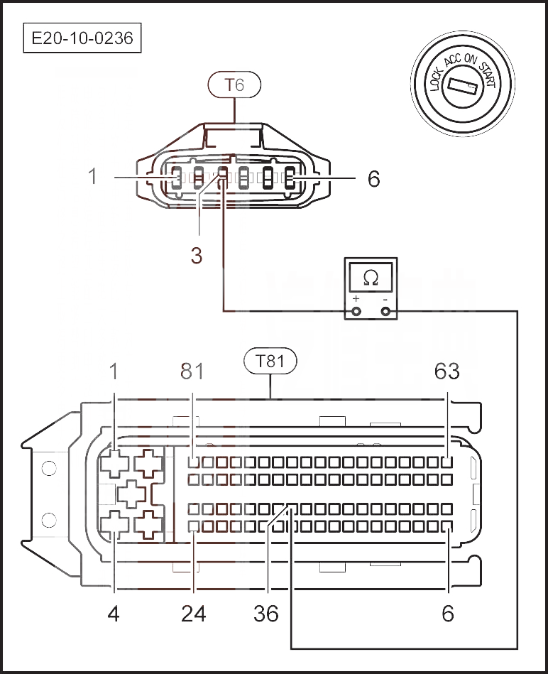 02-08 點火開關至LOCK狀態時,測量電子油門踏板位置傳感器插頭T6的3針腳至發動機控制單元插頭T81的36針腳之間導線是否導通。