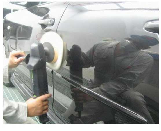 3 調整研磨拋光機轉速到1800r/min左右,使拋光機的海綿輪保持與漆面相切,力度適中、速度保持一定