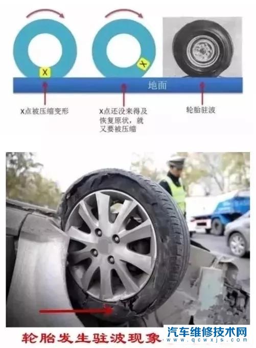 有些人可能會問:如果輪胎轉速超過了速度等級允許使用的最高速度會怎樣呢?在這種情況下,輪胎會發生一種可怕的現象:駐波現象。它是指輪胎在高速滾動過程中,由于被壓縮的部位沒有及時回位就被再次壓縮,從而導致輪胎呈現出多邊形的形狀。它會導致輪胎與地面之間的摩擦力急劇增大,產生大量的熱量,使輪胎急劇升溫,橡膠與簾線剝離,輪胎結構受到破壞,隨后發生爆胎!一般這種情況下輪胎損壞的特征是側壁多處破裂,有非常明顯的折痕,輪胎幾乎完全粉碎,只能報廢了。