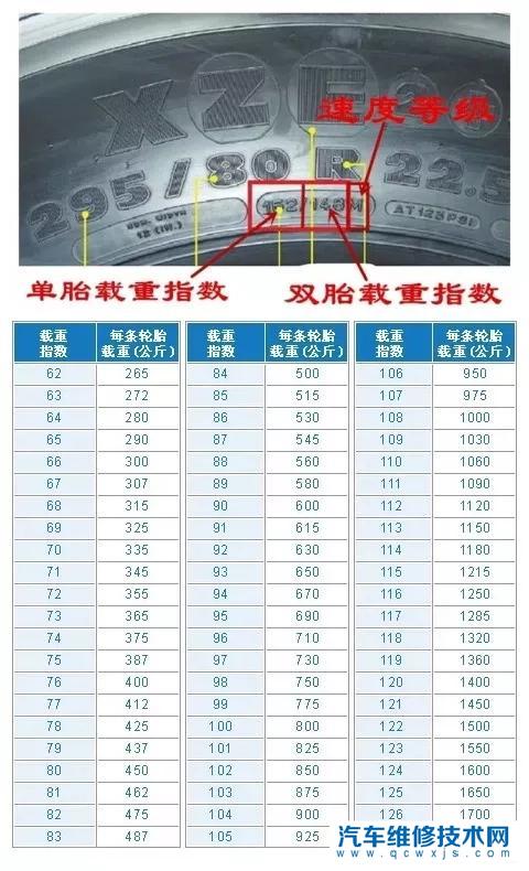 2、輪胎載重指數:輪胎的載重指數是指輪胎在按照規定的壓力充氣的情況下,輪胎所能承載的最大載重量。它通常用一個數字來表示,比如91表示每條輪胎的最大載重量為615Kg,96表示每條輪胎的最大載重量為710Kg,105表示每條輪胎的最大載重量為925Kg。很顯然,車越重,輪胎的載重指數也越大。我們普通家用車常用的輪胎載重指數一般在80~110之間,適用于車重在1.0~2.5噸之間的車型。不過輪胎的載重指數一般都有比較大的安全余量,即使稍微超過輪胎的最大載重量也是沒問題的,只是長時間這樣做會降低輪胎的使用壽命。