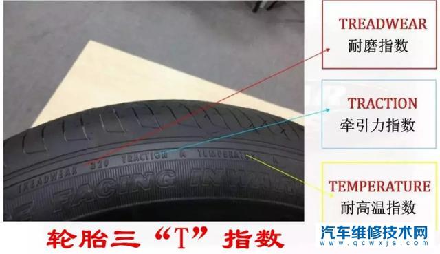 3、三“T”指數:所謂的三“T”指數是指輪胎的輪胎的耐磨指數、濕地牽引力指數以及溫度指數,由于它們的英文首字母都是T,故稱為“三T”。耐磨指數(Treadwear)表示的是輪胎的耐磨程度,以數字來表示,數字的高低代表了輪胎在相同使用環境下可行駛里程的多少,數字越大,表示該款輪胎越耐磨;濕地牽引力指數(Traction)可以理解為輪胎抓地力的水平,一般用AA、A、B、C表示,AA代表優秀,C最差;溫度指數(Temperature)表示的是輪胎自身散熱能力的優劣,一般溫度指數越高的輪胎,它的高速行駛穩定性越好,也也不容易爆胎。