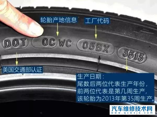 在輪胎側壁上一個小方塊內,標注有該輪胎的生產日期,由四位數字組成,后兩位表示年份,前兩位表示周數。比如“3513”表示2013年第35周生產的,這個數字對鑒定和購買二手車是非常重要的。其它的還有輪胎的認證標識,DOT表示美國交通部認證;輪胎的產地信息、工廠代碼等。