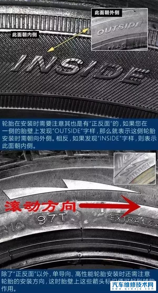 4、輪胎導向標識和輪胎內外標識:現在有很多車型使用非對稱花紋輪胎或單導向花紋輪胎,這種輪胎是有嚴格的安裝方向的。這樣的輪胎如果裝反了,或者同軸上的兩個輪胎胎紋運動方向相反,會極大的影響汽車的操控性能,嚴重時甚至會使汽車在極端情況下失控。因此,在這種輪胎的側面上有“OUTSIDE(向外)”或“INSIDE(向內)”標志,或有箭頭指示輪胎的滾動方向。
