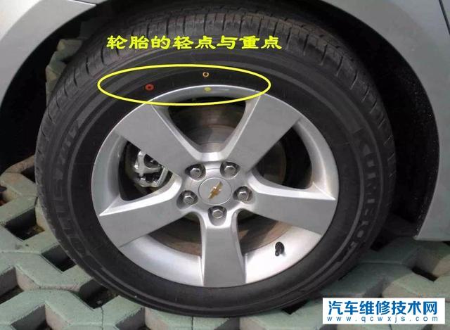 5、輪胎輕點與重點:輪胎是高速旋轉件,要求有嚴格的動平衡。但是在輪胎制造過程中,輪胎各部位的質量不可能是完全均勻分布的,必然有輕重之分。因此在輪胎上一般標注有黃色和紅色兩個小圓點,在輪輞上有一個白色的小圓點。實心紅點表示輪胎的“重點”,空心黃點表示輪胎的“輕點”,輪圈上的白點表示輪圈的“輕點”。在安裝輪胎時,將輪胎“實心紅點”對準“輪輞白點”,就是將輪胎的“重點”對準輪輞的“輕點”,讓二者盡可能補償平衡。