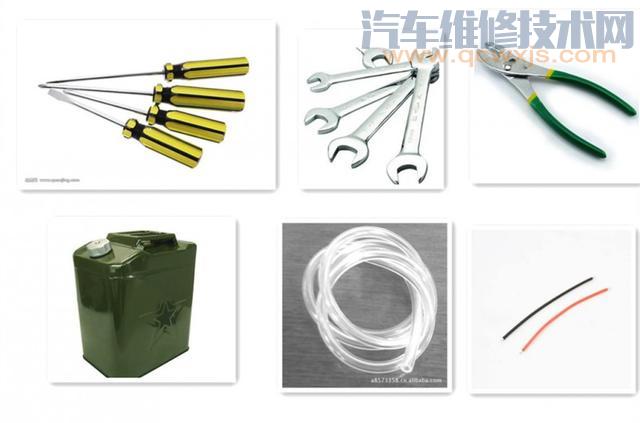 螺絲刀(平口、十字)、鯉魚鉗、開口扳手、直徑1厘米左右的膠皮管或者塑料管、一段導(dǎo)線、盛汽油的容器。