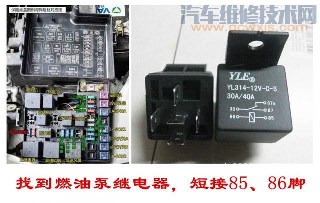 3、打開汽車的繼電器盒,找到燃油泵繼電器(盒蓋的里面有標(biāo)簽,很容易分辨的),然后把燃油泵繼電器拔下來放好。然后用導(dǎo)線短接繼電器插座上的85和86兩個(gè)插孔。