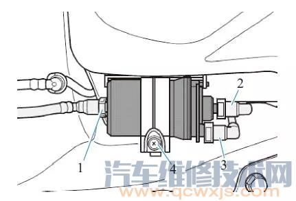 1—燃油濾清器;2—燃油供油管路(黑色,來自燃油箱);3—燃油回油管路(藍色,連接燃油箱);4—燃油供油管路(黑色,到發動機);5—螺栓;6—支架(用于支撐燃油濾清器)