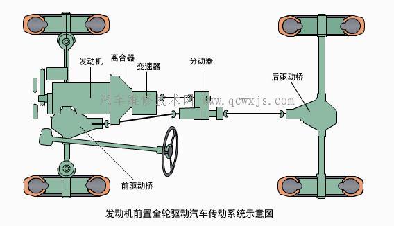 5.全輪驅動(AWD) 特點 是傳動系統增加了分動器,動力可以同時傳給前后輪。主要用于越野車及重型貨車。