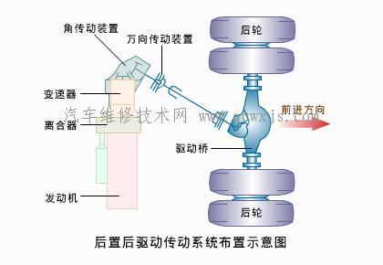 發動機 前置后輪驅動(FR)方案(簡稱前置后驅動) 主要用于貨車、部分客車和部分高級汽車