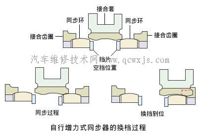 自行增力式同步器與常壓式和慣性式同步器一樣,也是利用摩擦原理實現同步,主要區別在于同步環產生的摩擦力矩由于同步環內的彈簧片作用而得到成倍的增長。