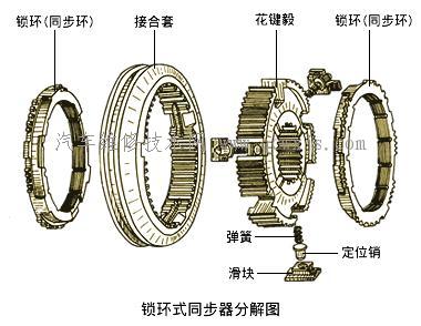 變速器同步器是利用摩擦原理 實現同步的,現代汽車上廣泛使用的是慣性式同步器,同步器可以從結構上保證待嚙合的接合套與接合齒輪的花鍵齒在達到同步之前不可能接觸,可以避免齒間沖擊和噪音。