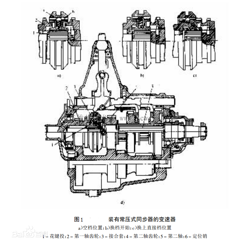 由于接合套與花鍵轂之間有彈簧頂住的定位銷6,若駕駛員作用在接合套上的力不大,則 定位銷便阻止接合套在花鍵轂停止不動的情況下繼續向左移動。此時位置如圖1b所示。兩錐匭在駕駛員通過操縱機構加于接合套和花鍵轂上的力的作用下互相壓緊。齒輪2與花鍵轂存在轉速差,因而兩錐面一經接觸,便產生摩擦作用。這種摩擦作用促使第一軸齒輪的轉速迅速降低到與花鍵轂的轉速(亦即接合套的轉速)相等,因而二者花鍵齒的圓周速度相等(同步)。