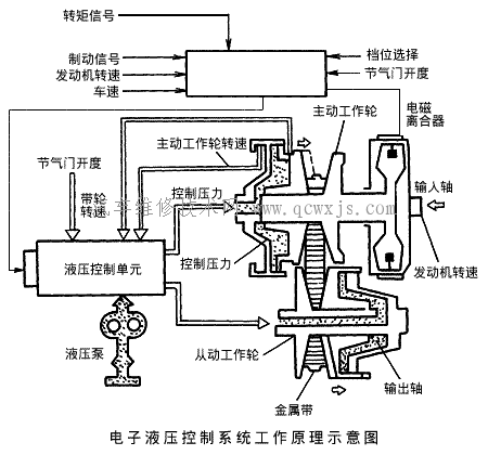 金屬帶(鏈條)式無級變速器(VDT-CVT)組成和工作原理 變速器 10-27 金屬帶(鏈條)式無級變速器(VDT-CVT)組成VDT-CVT是由金屬帶、主動工作輪、從動工作輪、液壓泵、起步離合器和控制系統(tǒng)等組成...