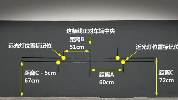 2、出于在墻上設置這些標準線,我們要事先測量出汽車大燈位置這3個距離,距離A是近光燈中心到車中軸線的距離;距離B是遠光燈中心到車中軸線的距離;距離C是近光燈中心到地面的距離。