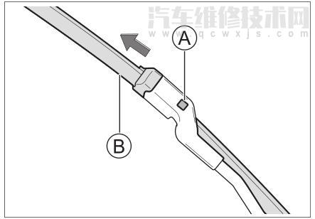 如圖按住彈性鎖片,同時沿圖示箭頭方向拉動雨刮片,直至其從雨刮臂上脫開。