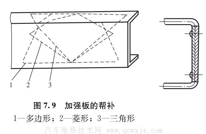 (7) 當縱梁完全斷裂或裂紋較長,又是最大受力部位時,可采用槽形加強板加強,一 般采用鉚接法,如圖7. 10所示。