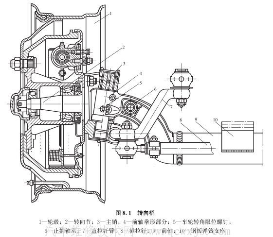 汽車整體式轉向橋結構大致相同,其主要由前軸、輪轂、轉向節和主銷等部分組成,如圖8.1