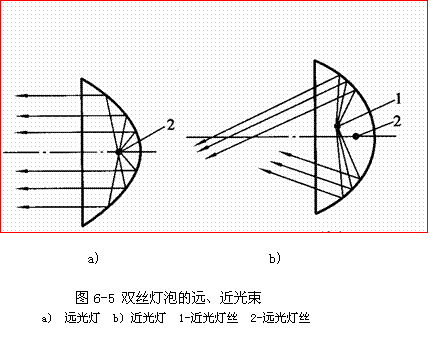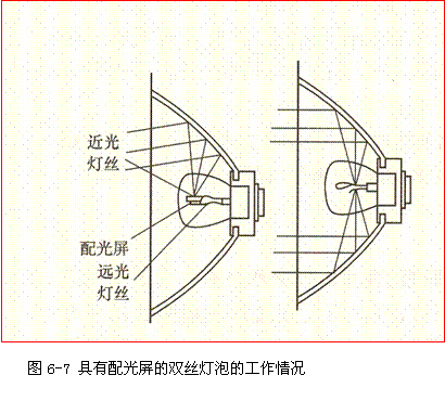 遠光燈絲位于反射鏡的焦點上,近光燈絲則位于焦點前方且稍高出光學軸線,其下方裝有金屬配光屏,如圖6-7所示。