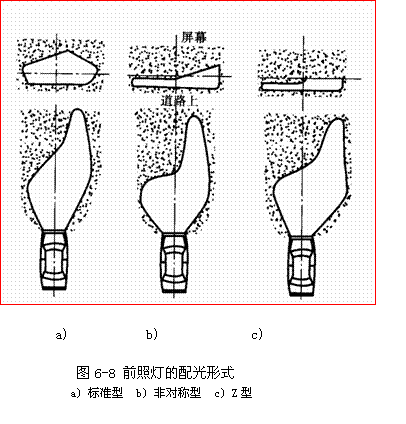 Z型配光光形的明暗截至線呈Z形,它不僅解決了會車駕駛員防炫目的問題,還可以防止對面行人和非機動車使用者的炫目。具體的配光形式,如圖6-8所示。