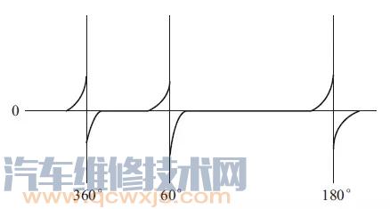 1號進氣凸輪軸上的前端設置有三個正時銷,分別代表60°、180°、360°曲軸轉角,根據正時銷的輸出信號,ECU進行實際凸輪軸位置的檢測和汽缸識別,凸輪軸轉動時,正時銷與凸輪轉角傳感器間氣隙發生變化,從而改變通過凸輪轉角傳感器的磁通量,凸輪軸每轉動一圈產生3個脈沖,輸出波形如圖2所示。根據來自曲軸位置傳感器信號,1號凸輪軸相位被檢測,根據這個相位,可變氣門正時控制器發揮作用。