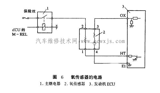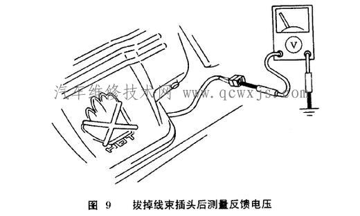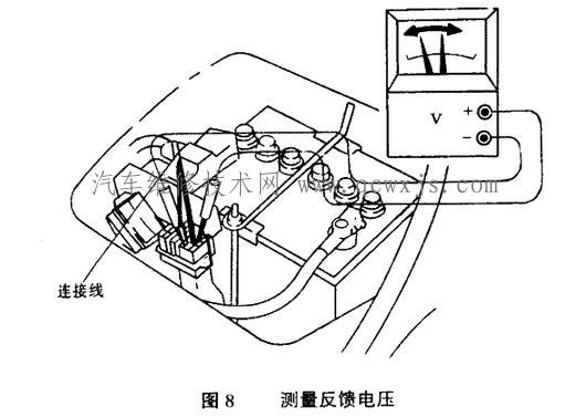 氧傳感器是否損壞,可按下述方法檢查:拔下氧傳感器的線束插頭,使氧傳感器不再與ECU連接,將電壓表的正極測筆直接與氧傳感器反饋電壓輸出端連接(圖 9),然后,發動機正常運轉時脫開接在進氣管上的曲軸箱強制通風管或其他真空軟管,人為地形成稀混合氣,此時電壓表讀數應下降到0.1-0.3V;接上脫開的曲軸箱通風管或真空軟管,再拔下水溫傳感器接頭,且用一個4-8KΩ的電阻代替水溫傳感器(或堵住空氣濾清器的進氣口),人為地形成濃混合氣,此時,電壓表讀數應上升到0.8-1.OV。也可以用突然踩下或松開油門踏板的方法來改變混合氣濃度。在突然踩下油門踏板時,混合氣變濃,反饋電壓應上升;突然松開油門踏板時,混合氣變稀,反饋電壓應下降。