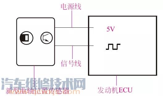 對于霍爾式曲軸位置傳感器,不能采取測量電阻的方法判斷其性能好壞。霍爾式曲軸位置傳感器有3個端子,一個是外供電源線,由ECU提供5V電源,一個是搭鐵線,另一個是信號線。在一個霍爾式曲軸位置傳感器中,包含霍爾元件、放大電路、整形電路以及輸出電路等。