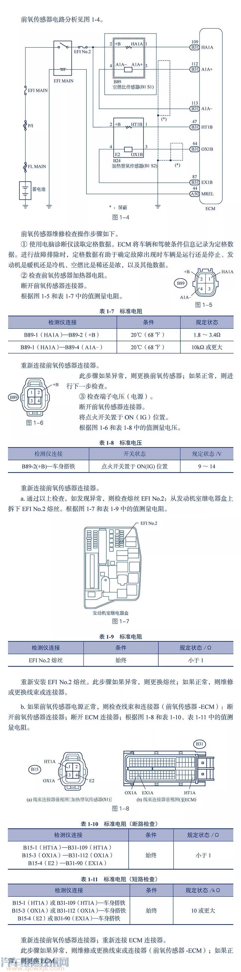氧傳感器信號端子的輸出電壓。當拔掉某個氣缸的高壓線(斷火),排氣中的含氧量將下降,如果電壓表指示的電壓有所升高,說明傳感器性能良好(氧傳感器輸出電壓一般在0.2~0.9V,其變化范圍在0.5V左右)。