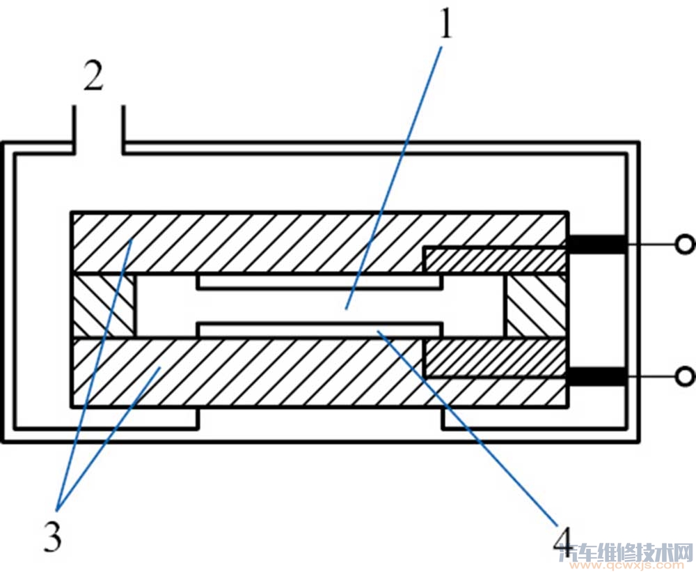 電容式進氣壓力傳感器利用氧化鋁膜片和底板彼此靠近排列形成電容,根據其電容量隨膜片上下壓力差變化的性質研制而成。電容式進氣壓力傳感器結構見圖2-84。