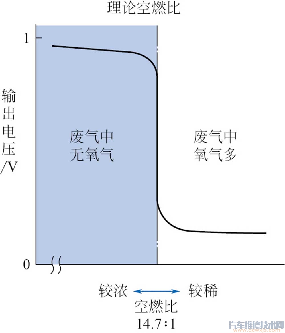 二氧化鋯式氧傳感器鋯管的陶瓷體是多孔的,滲入其中的氧氣,在溫度較高時(shí)發(fā)生電離。由于鋯管內(nèi)、外側(cè)氧含量不一致,存在濃差,因而氧離子從大氣側(cè)向排氣一側(cè)擴(kuò)散,從而使鋯管成為一個(gè)微電池,在兩鉑電極間產(chǎn)生電壓。當(dāng)混合氣的實(shí)際空燃比小于理論空燃比,即發(fā)動(dòng)機(jī)以較濃的混合氣運(yùn)轉(zhuǎn)時(shí),排氣中氧含量少,但CO、HC、H2等較多。這些氣體在鋯管外表面的鉑催化作用下與氧發(fā)生反應(yīng),將耗盡排氣中殘余的氧,使鋯管外表面氧氣濃度變?yōu)榱悖@就使得鋯管內(nèi)、外側(cè)氧濃差加大,兩鉑極間電壓陡增。因此,鋯管氧傳感器產(chǎn)生的電壓將在理論空燃比時(shí)發(fā)生突變:稀混合氣時(shí),輸出電壓幾乎為零;濃混合氣時(shí),輸出電壓接近1V。