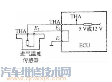 拔下傳感器插頭,接通點火開關,測量插頭上THA端子與E2端子之間的電壓應為5V。若無電壓,則應檢查ECU連接器上THA端子與E2端子間的電壓。若此電壓為5V,則為ECU與傳感器之間線路有故障;若無5V電壓,則為ECU故障。