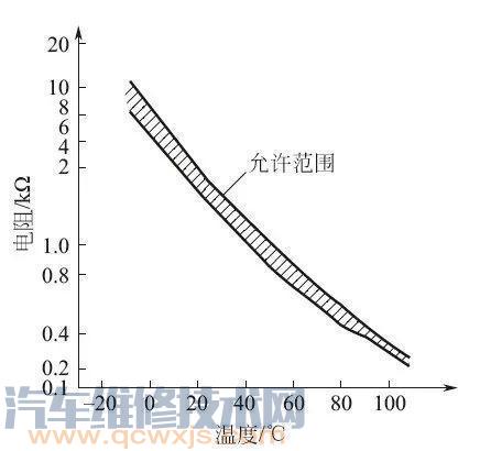 檢查進氣溫度傳感器,可測量端子間的電阻,在20℃時其值為2.21~2.69kΩ,在80℃時電阻值為0.322kΩ。電阻值如不正常,應更換進氣溫度傳感器。