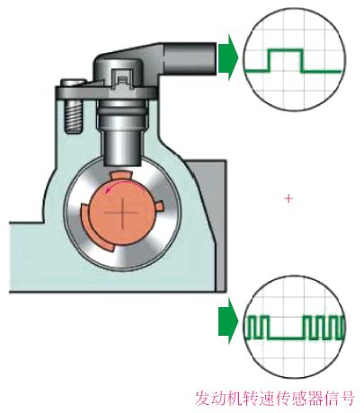 霍爾傳感器由永磁鐵和霍爾集成電路組成。當發動機運轉時,輪齒的高低部分與傳感器之間的間隙發生變化。這種變化的間隙會引起傳感器附近的磁場發生變化。由于磁場的變化,來自傳感器的電壓也會改變。