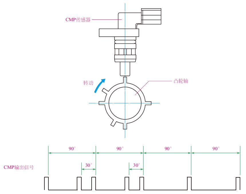 當凸輪軸上的凸起物在凸輪軸的旋轉作用下經過CMP 傳感器的電磁閥時,它們會導致磁通量發生變化。CMP 傳感利用處理電路將磁通量的變化轉換為數字波形(矩形波)。ECU 根據凸輪軸位置波形檢測發動機轉速和凸輪軸位置。