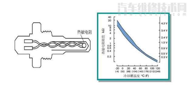 從新型汽車上使用的冷卻液傳感器情況來看,大都由負溫度系數的熱敏電阻組成,用于將檢測到的水溫轉換為電壓信號提供給發動機ECU。