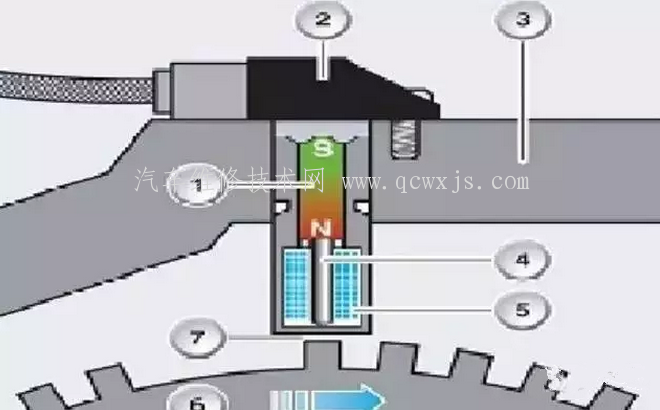 在電磁感應(yīng)式傳感器與齒圈之間只有一個很小的間隙。經(jīng)過線圈的磁流情況取決于傳感器對面是間隙還是輪齒。輪齒將散亂的磁流集中起來,而間隙則會削弱磁流。飛輪及齒圈轉(zhuǎn)動時,就會通過各個輪齒使磁場產(chǎn)生變化。