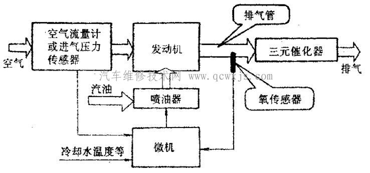 氧傳感器隨時(shí)檢測(cè)排氣中的氧濃度,并隨時(shí)向微機(jī)控制裝置反饋信號(hào)。微機(jī)則根據(jù)反饋來(lái)的信號(hào)及時(shí)調(diào)整噴油量(噴油脈寬),如信號(hào)反映混合氣較濃,則減少噴油時(shí)間;反之,如信號(hào)反映較稀,則延長(zhǎng)噴油時(shí)間。從而使混合氣的空燃比始終保持在理論空燃比始終保持在理論空燃比附近(見圖2)。這就是燃料閉環(huán)控制或稱燃料反饋控制。