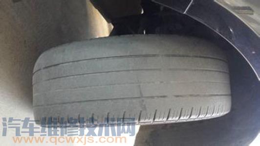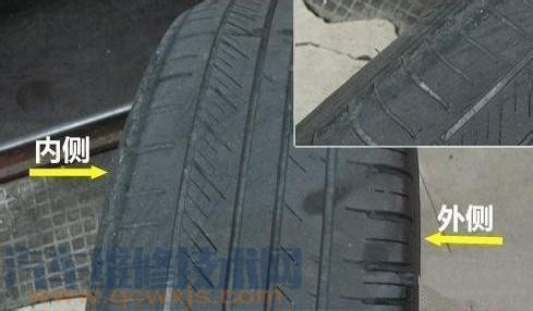 原因是前束或外傾角過大、轉向節臂彎曲等,輪胎內側吃胎,原因前束或外傾角過小。
