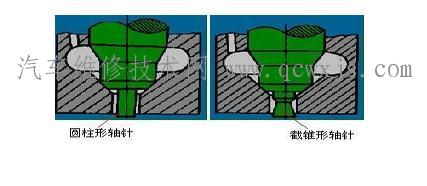 ·在軸針式噴油器中,針閥密封錐面以下有一段軸針,它穿過針閥體上的噴孔且稍突出于針閥體之外,使噴孔呈圓環形。因此,軸針式噴油器的噴注是空心的 ·圓柱形軸針:噴注的噴霧錐角較小 ·截錐形軸針:噴注的噴霧錐角較大