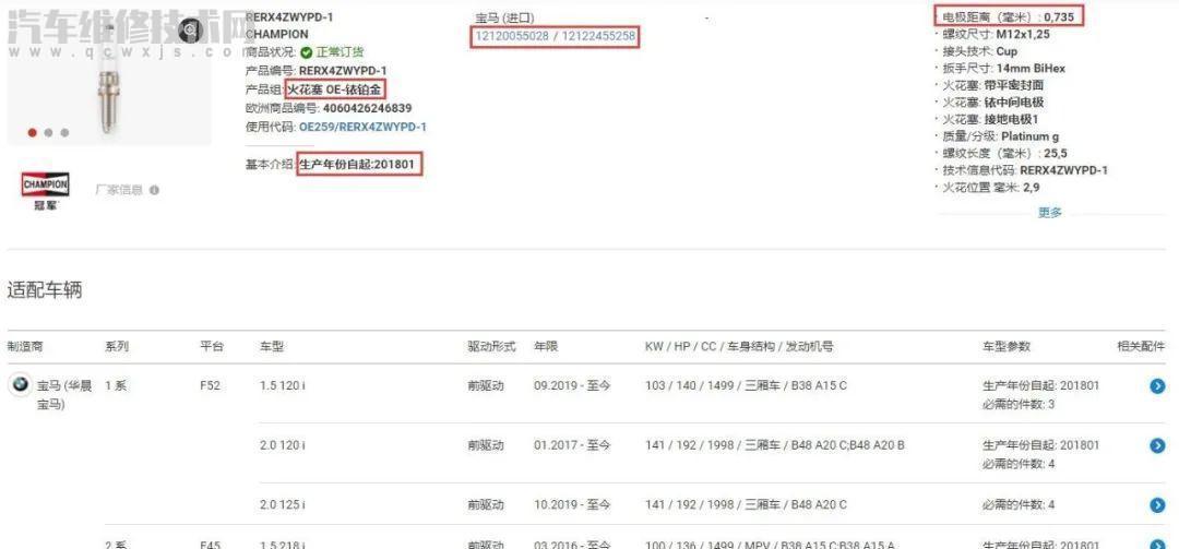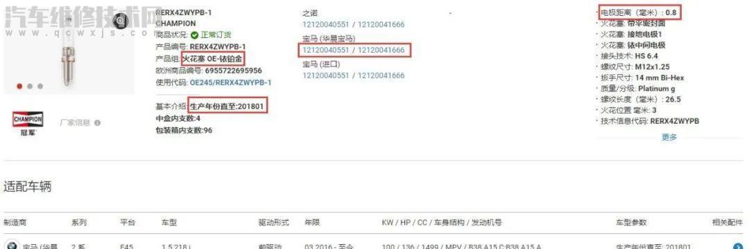這兩張圖片是冠軍兩款火花塞的具體信息,可以看出OE245/RERX4ZWYPB-1是2018年1月就截止的,而OE259/RERX4ZWYPD-1是從2018年1月開始的,就像承上啟下似的。它們都能用于寶馬2系220i,而兩張圖中的220i使用的是相同的發動機。