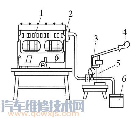 S-SY10型手動試壓泵可用于缸體的水壓試驗,主要由壓力表、帶橡膠水管的連接盤與一個盛水的水桶等組成。試驗時,將具有300~400kPa的壓力水,注入發(fā)動機缸體的水套內,在該壓力下保持一定的時間,檢查氣缸體不應有滲漏,如圖2-52所示。