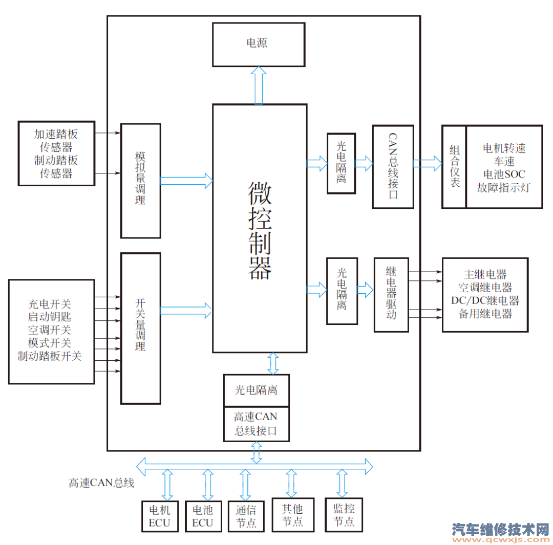 下圖為某公司開發的純電動汽車整車控制器組成原理圖。整車控制器的硬件電路包括微控制器、開關量調理、模擬量調理、繼電器驅動、高速CAN總線接口、電源等模塊。