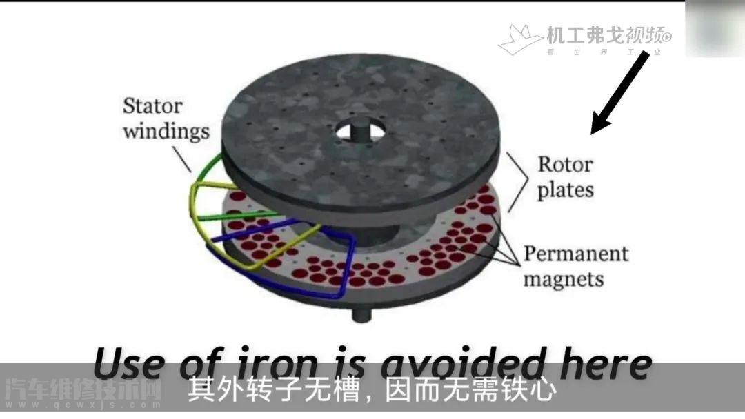 軸向磁通無鐵心永磁電機是當前最先進的電動汽車用電機。其外轉子無槽,因而無需鐵心。 它也無定子鐵心,因而重量輕。氣隙磁場的徑向分量提供了更高的功率密度。這種電機的轉子可裝在車輪側,定子繞組放在軸上。無槽設計令其銅損少,效率高,可用空間多。雷諾Coupe就采用了這種電機。