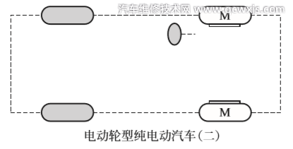 電動輪型純電動汽車的另一種結構如圖所示,這種結構將低速外轉子電動機的外轉子直接安裝在車輪的輪緣上,去掉了減速齒輪,所以電動機和車輛的驅動車輪之間沒有任何機械傳動裝置,無機械傳動損失,能量的傳遞效率高,空間的利用率大。但是這種結構對于電動機的性能要求較高,要求其具有很高的啟動轉矩以及較大的后備功率,以確保車輛的可靠工作。