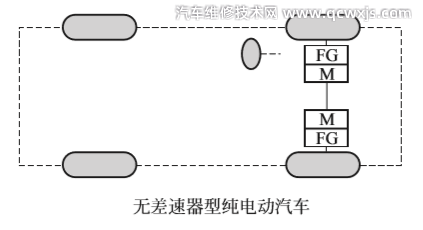 無變速器型純電動汽車的一種結構如圖所示,該結構的最大特點是取消了離合器與變速器,采用固定速比減速器,通過控制電動機來實現變速功能。這種結構的優點是機械傳動裝置的重量輕、體積小,但是對電動機的要求比較高,不僅要求具有較高的啟動轉矩,而且要求具有較大的后備功率,以確保純電動汽車的起步、爬坡、加速等動力性能。