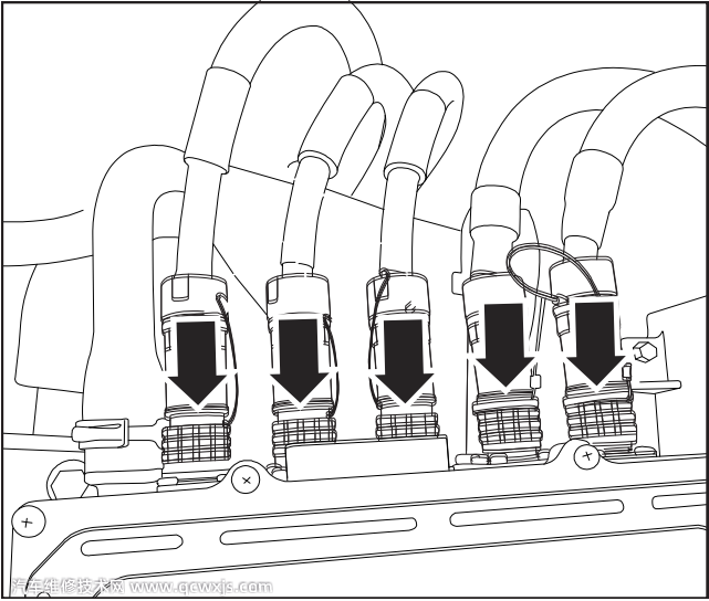 7.將MCU直流母線電纜及UVW三相高壓電纜鎖止螺母往箭頭方向往遠離MCU方向推出。