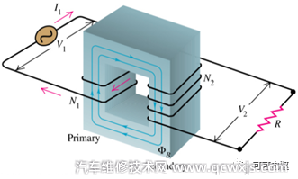 變壓器有兩組螺旋線圈。初級螺旋線圈1和次級螺旋線圈2,如圖5。當初級螺旋線圈1通上交流電V1時,根據安培定則,初級螺旋線圈1產生磁感應,磁感應線經鐵芯,穿過次級線圈2,根據法拉第電磁感應定律,次級螺旋線圈2則產生感應電動勢V2。兩組螺旋線圈匝數比等于電壓比。