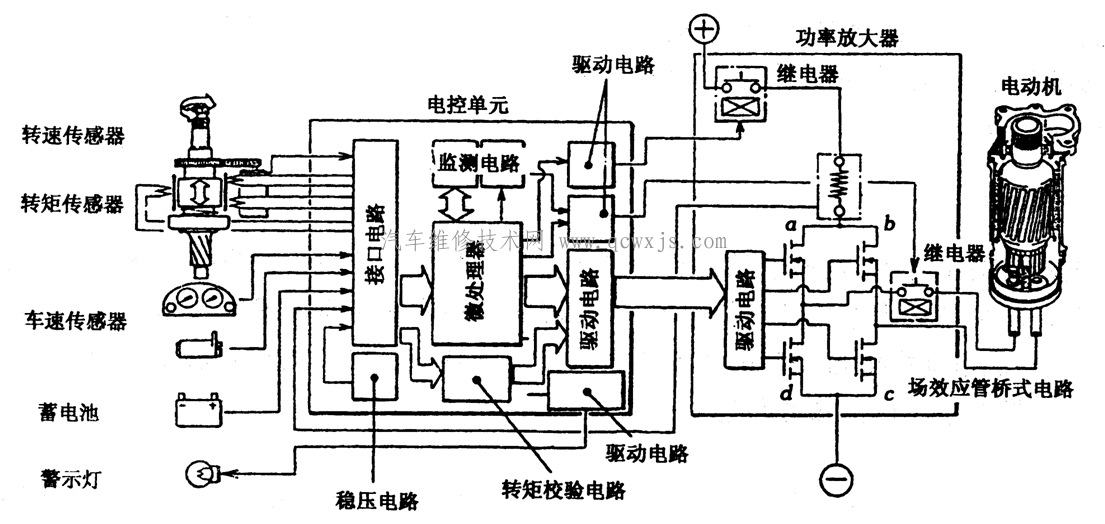 電動助力轉向系統一般由扭矩傳感器、電控單元(微處理器)、電動機與電磁離合器、減速器等組成。